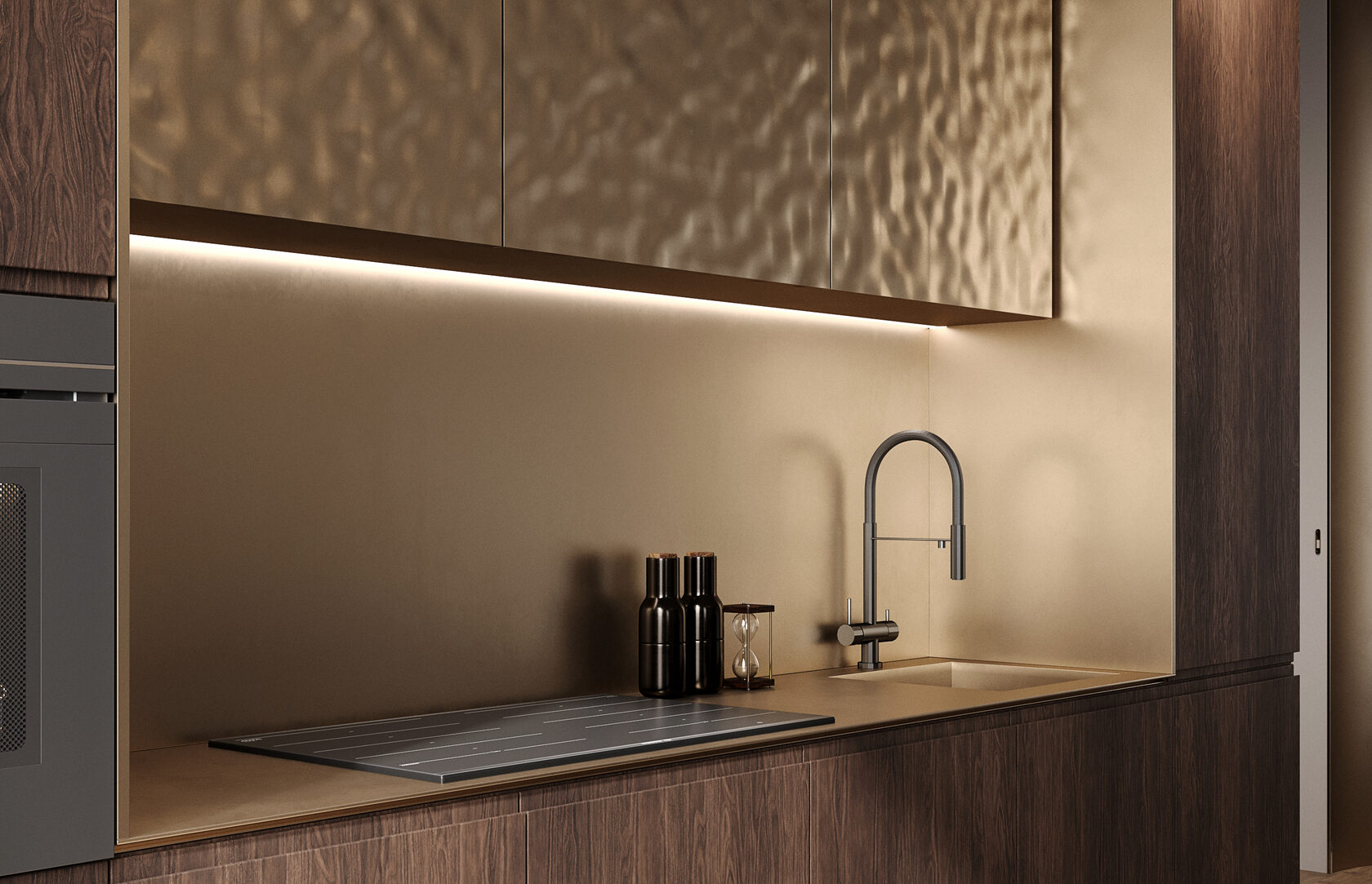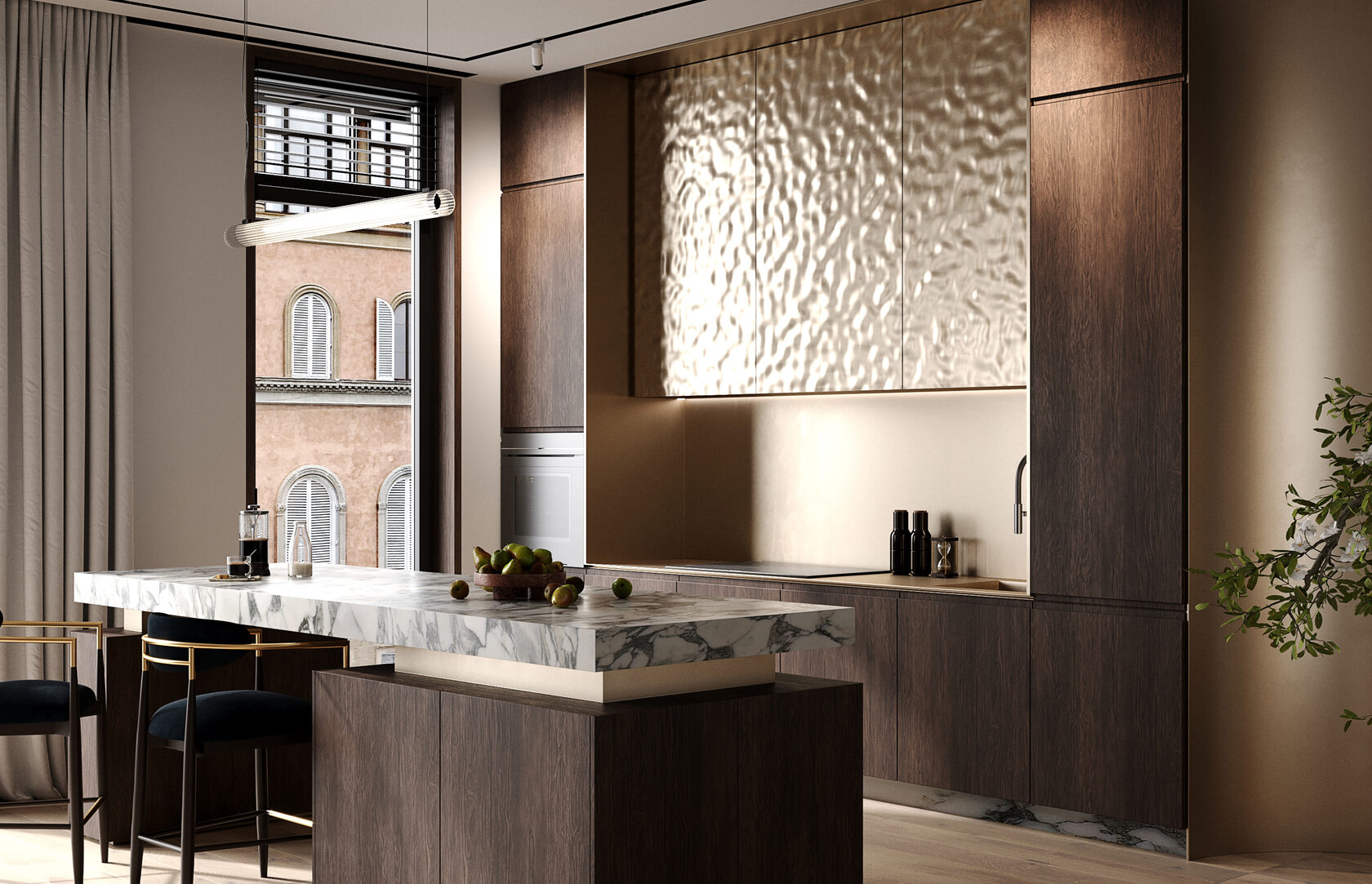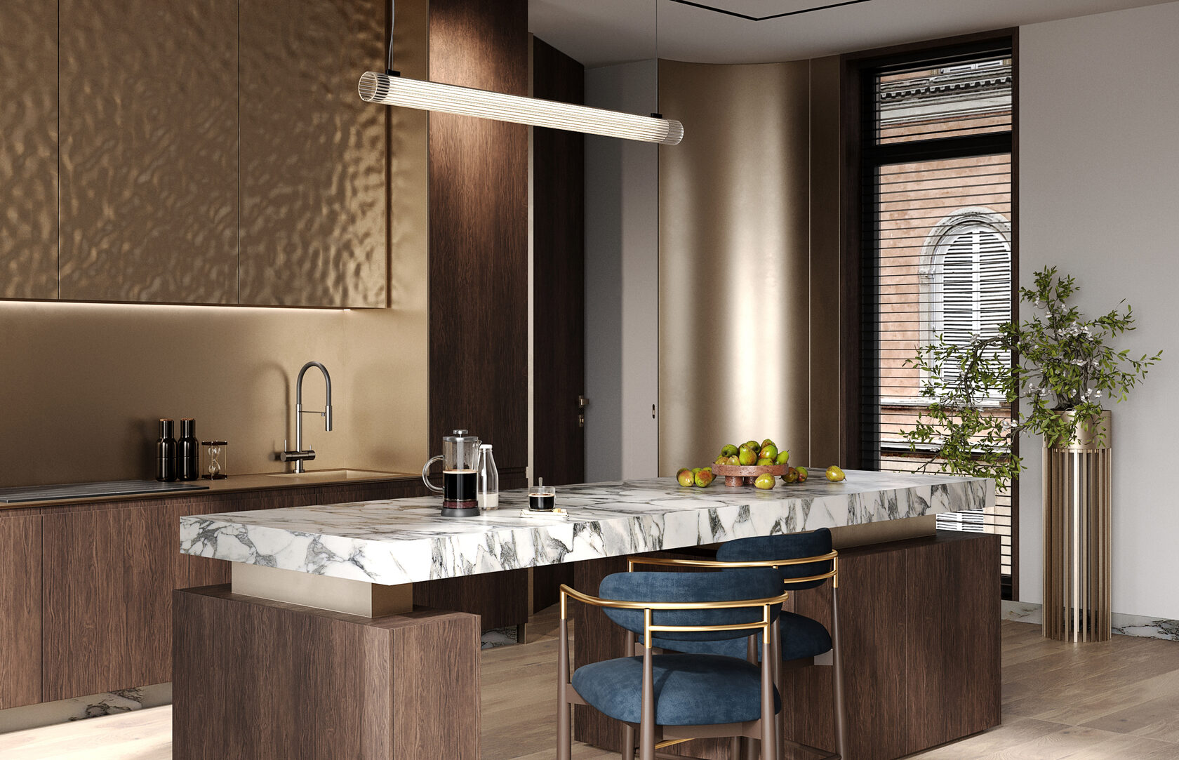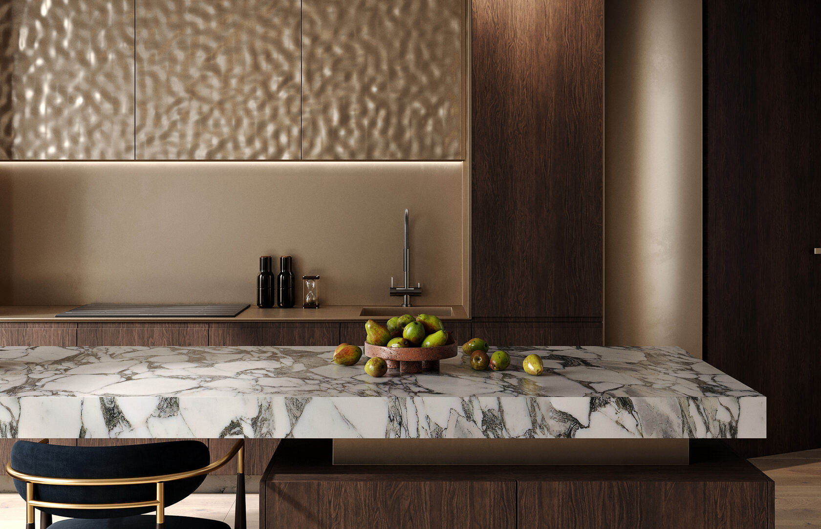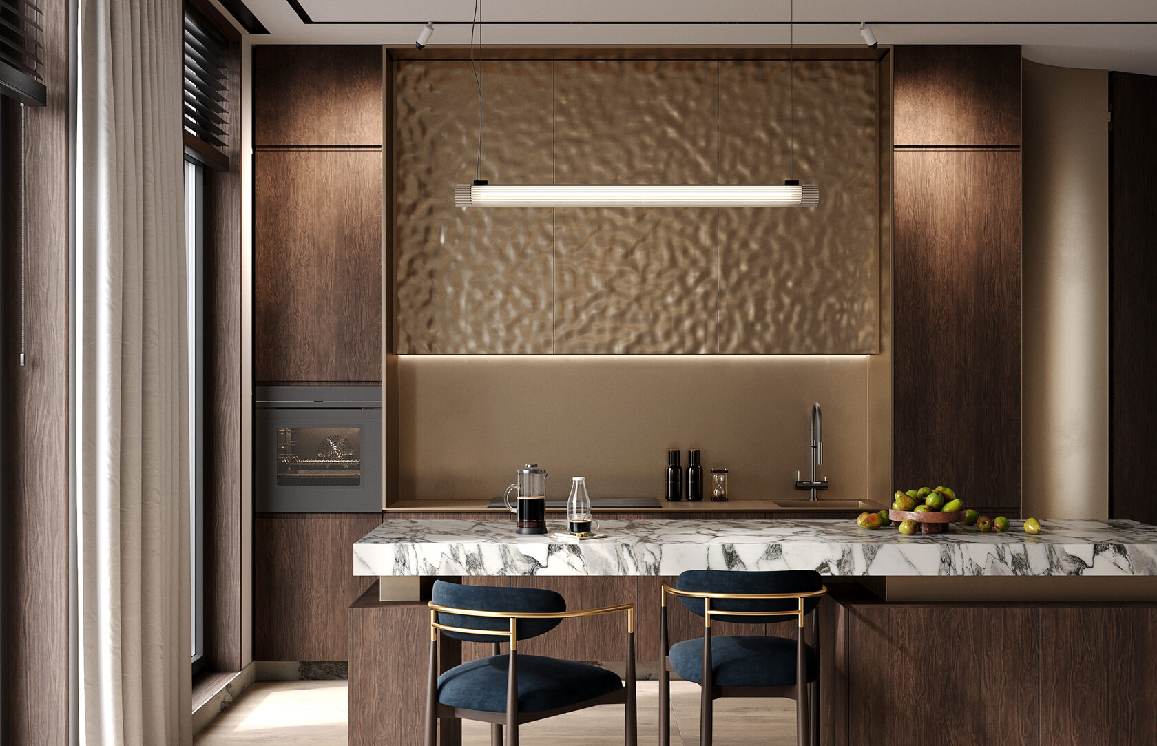 Отделка фасадов жидким металлом, которую я использовала в проекте кухни, впечатляет с первого взгляда и делает интерьер запоминающимся. Жидкий металл отлично сочетается с другими материалами и украшает интерьер в любом стиле. Спокойные оттенки шкафов и фартука, активная столешница острова, синий оттенок обивки стульев – эта игра цветов поддержана в интерьере разнообразием благородных фактур.