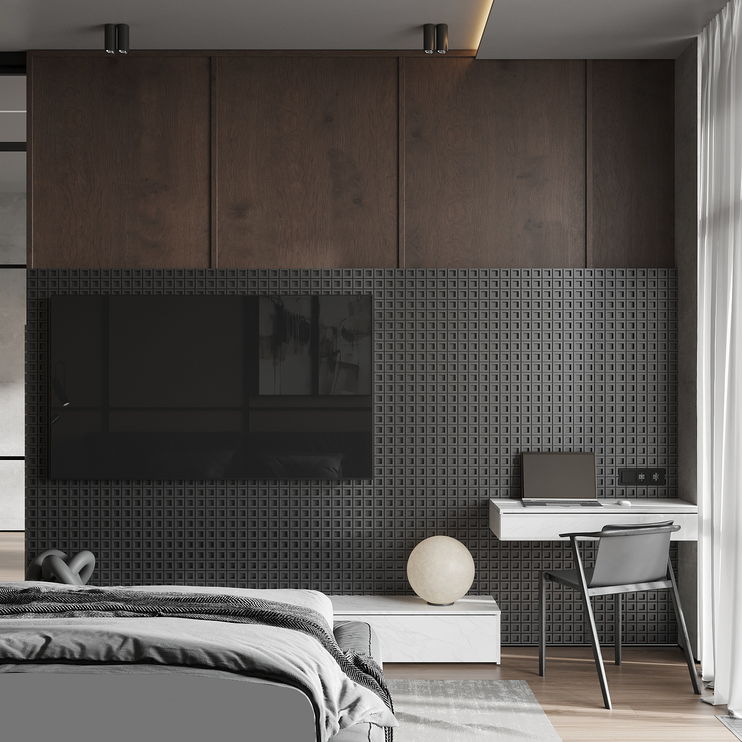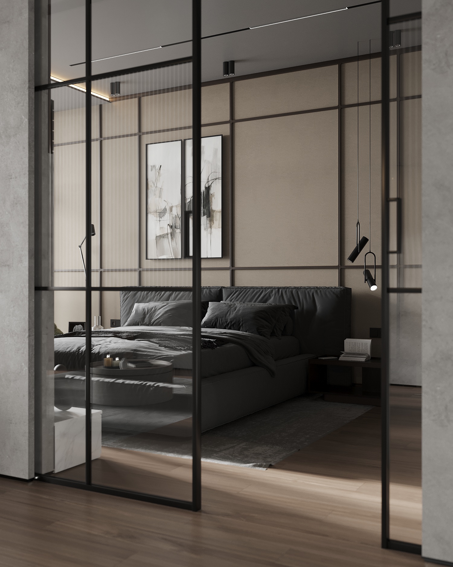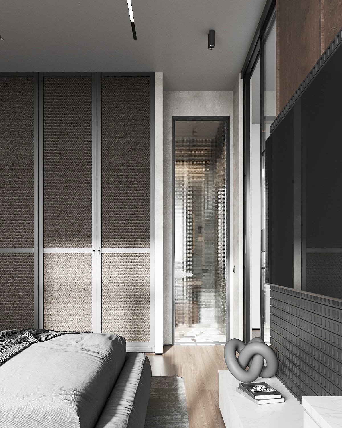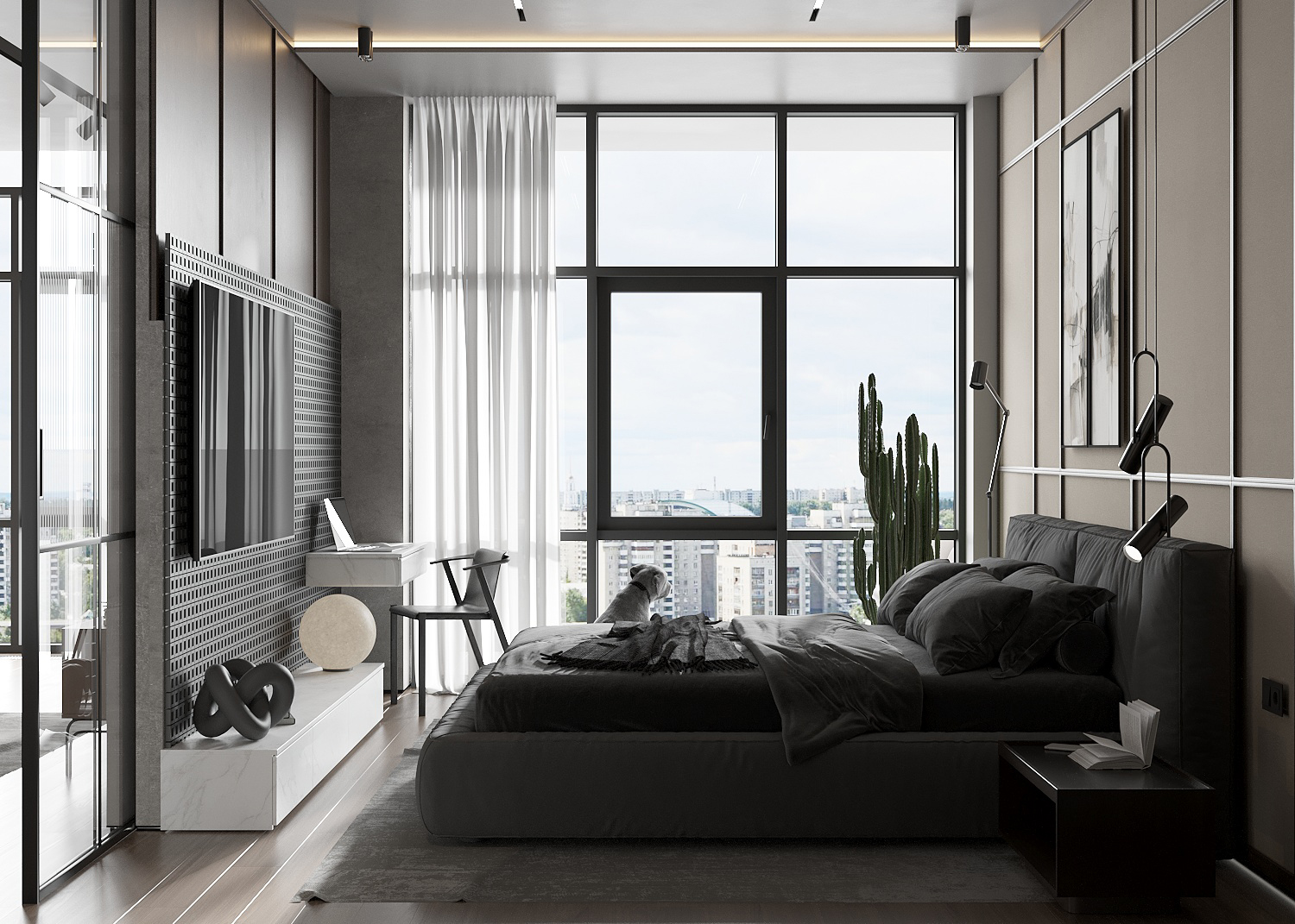 Здесь все необходимое расположено в строгом порядке: большая комфортная кровать, тумбочки, ТВ, рабочее место, разнообразное освещение, гардеробный шкаф и вход в ванную сразу из спальни. Большое панорамное окно с видом на город поддержала внутренняя стеклянная откатная дверь в гостиную. Здесь много света и воздуха, благодаря этому глубокие тона не выглядят тяжело, а создают подходящую атмосферу для личной перезагрузки.