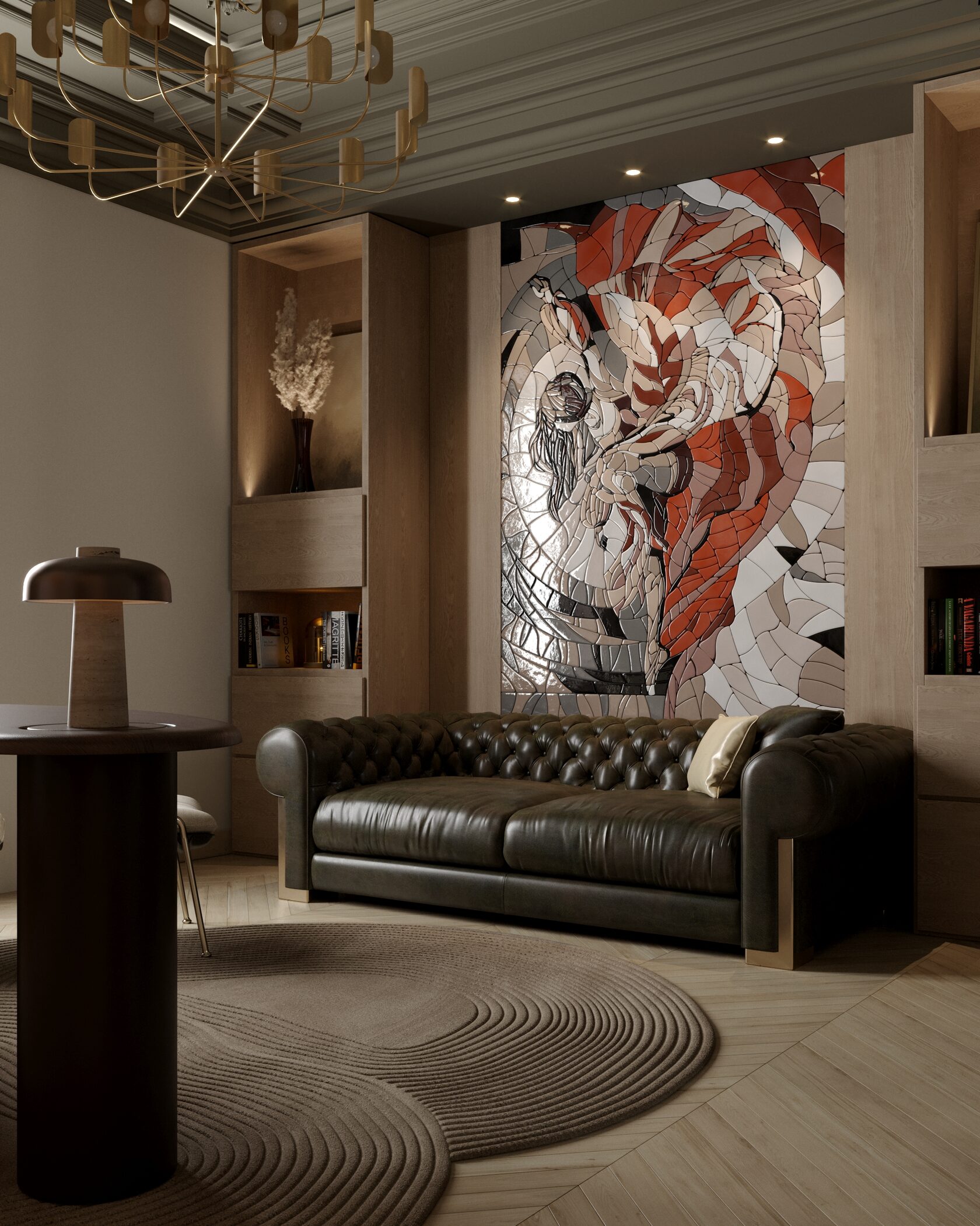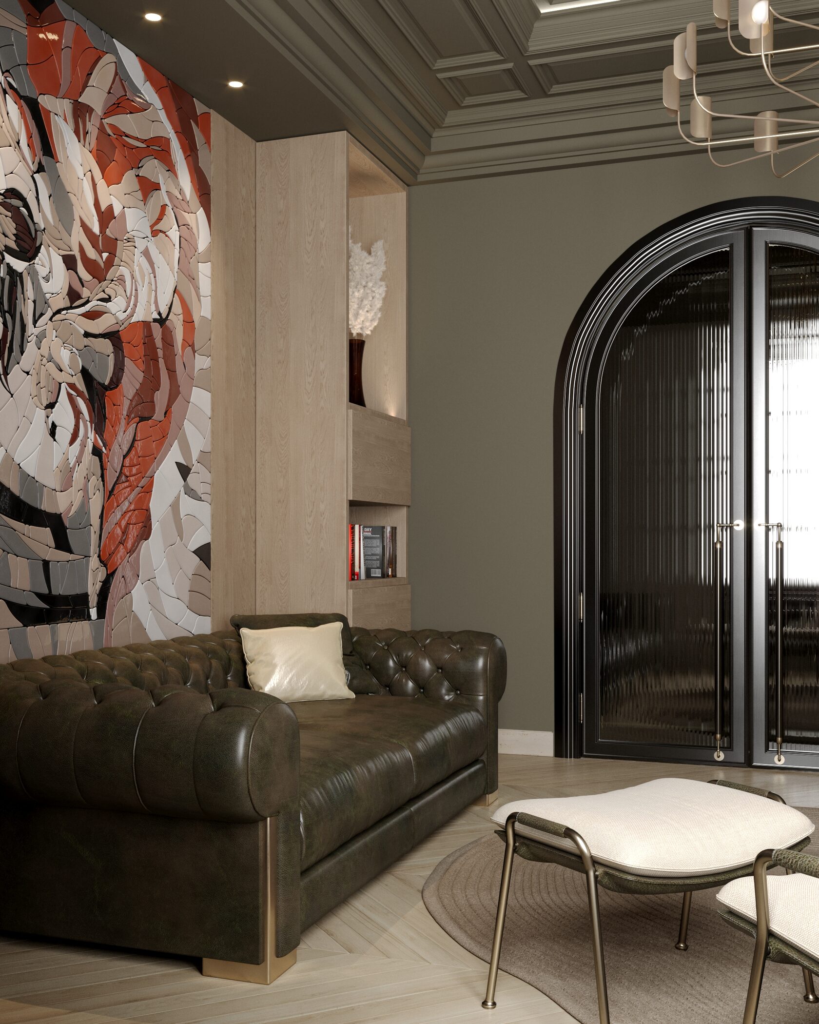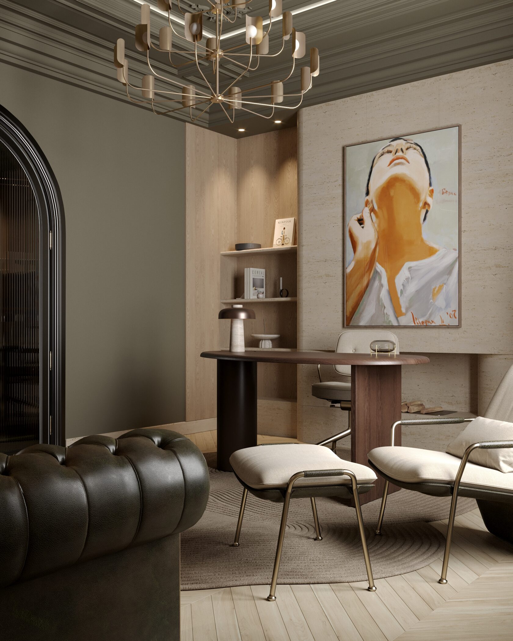 Этот яркий, стильный и функциональный кабинет сочетает в себе разные формы и детали, которые создают нужную рабочую обстановку с возможностью расслабиться и отвлечься: классический для кабинета диван соседствует с современным искусством, форма дверей перекликается с окнами дома напротив, небольшой аккуратный стол округлой формы окружен симметрично расположенными стеллажами, кресло с пуфом для ног приглашает отдохнуть в перерывах между работой. В этом интерьере есть все необходимые атрибуты рабочего пространства и интересные детали, которые хочется разглядеть, чтобы разгадать эту интересную композицию и идею.