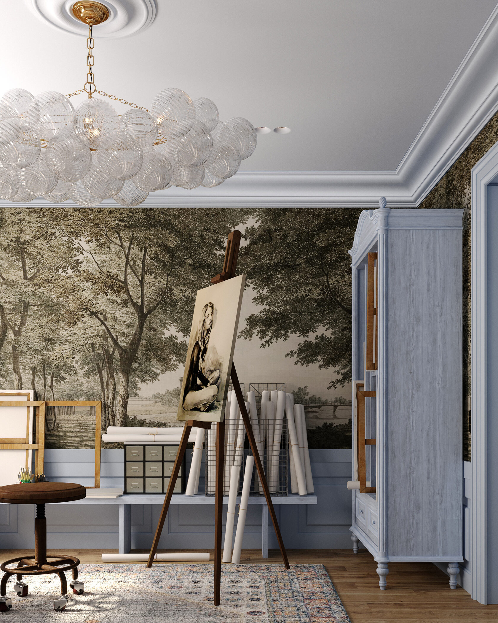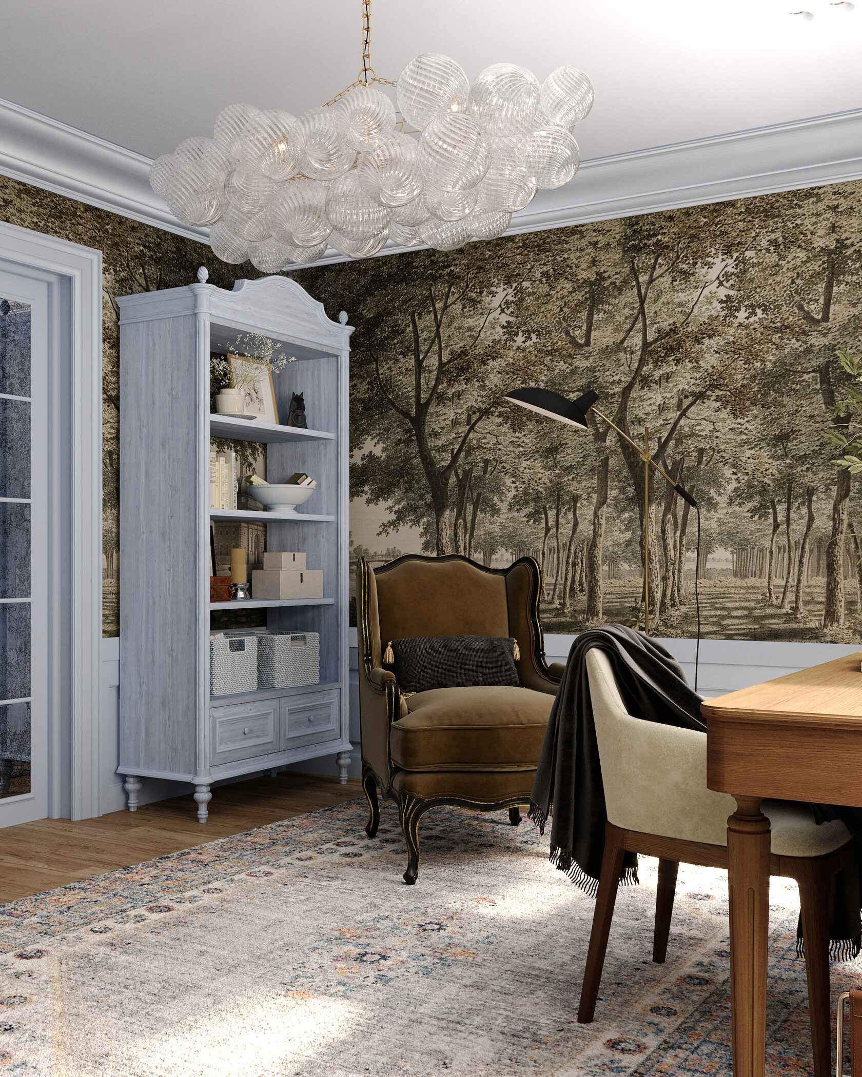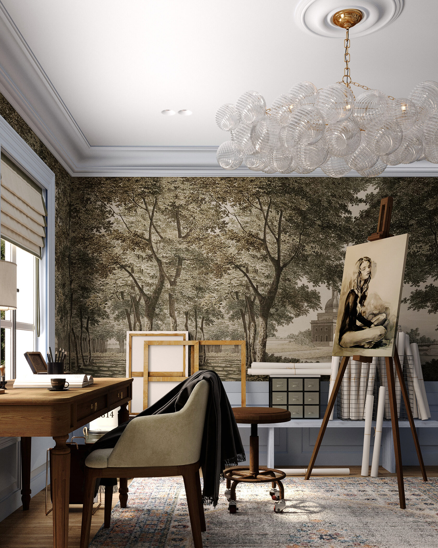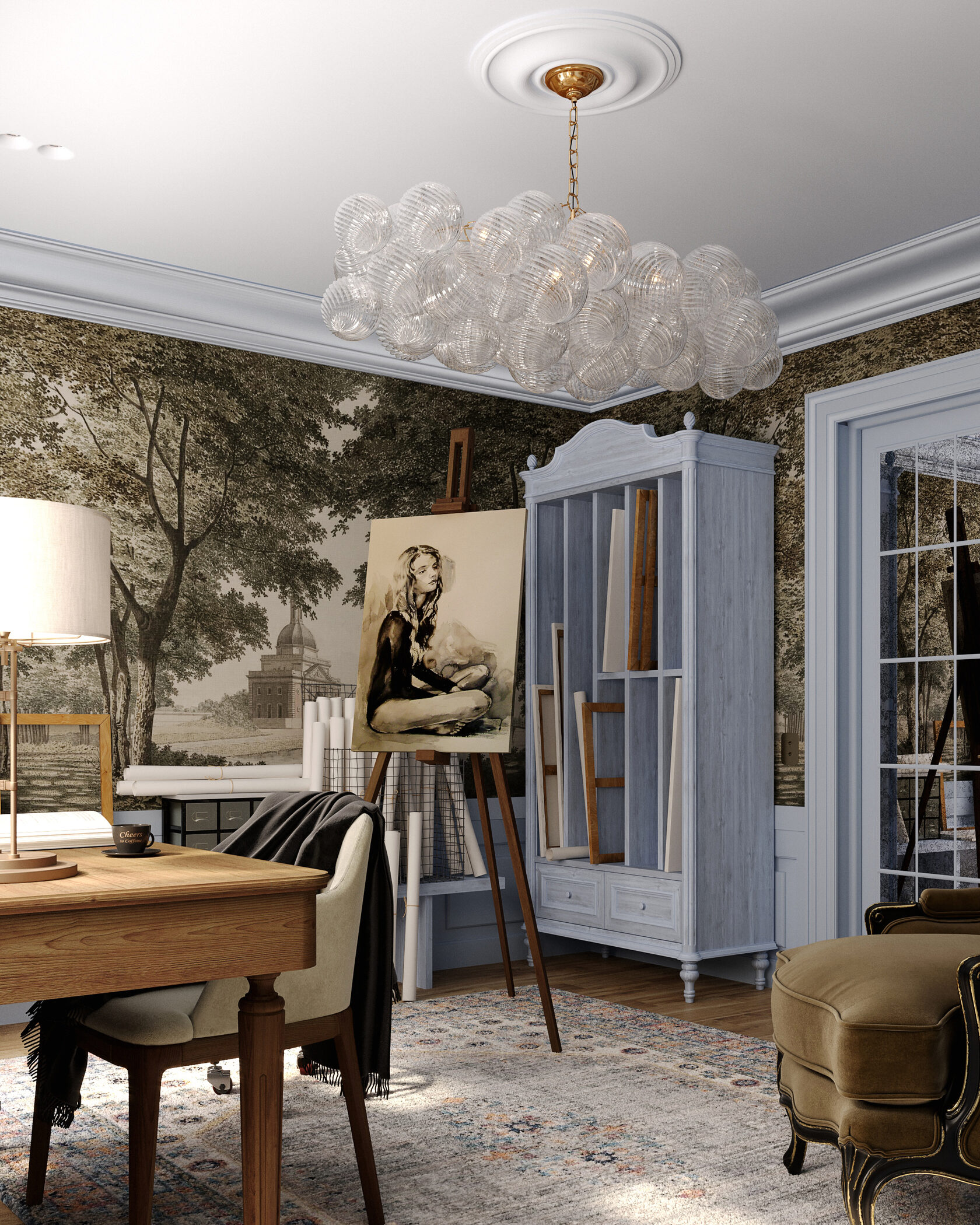 Здесь мотивы прошлого соседствуют с современно легкостью. Оформление стен, имитирующее старинный парк, состаренная мебель, деревянный пол, основательный стол, объемное мягкое кресло создают роскошную взрослую атмосферу. А зеркальные двери, обилие белого цвета и потолочный светильник с прозрачными плафонами, похожий на огромное облако, словно напоминают, что не стоит все воспринимать слишком серьезно и добавляют пространству легкости и воздуха. Этот интерьер дополняет свою хозяйку и помогает творить смело, ярко, уверенно.