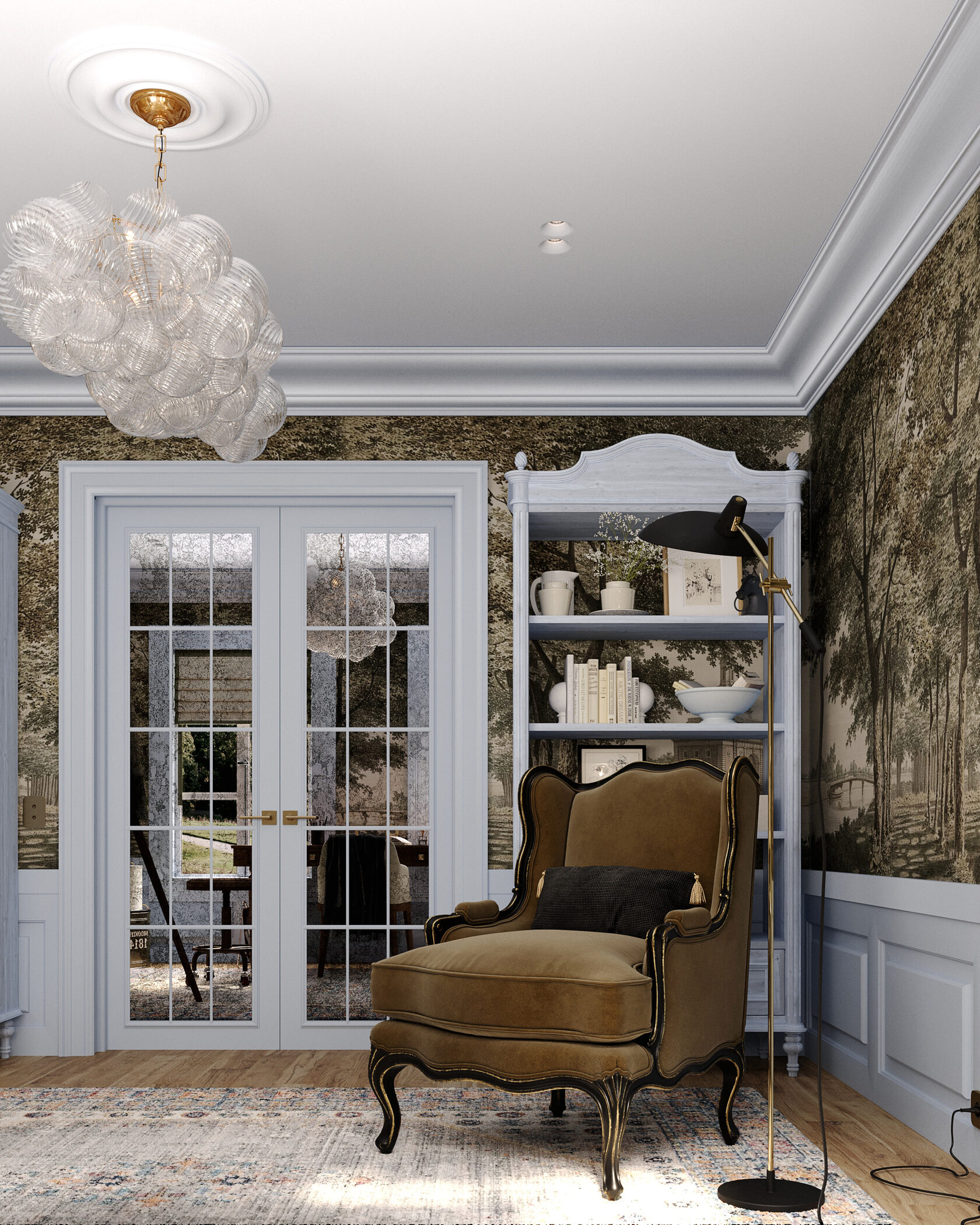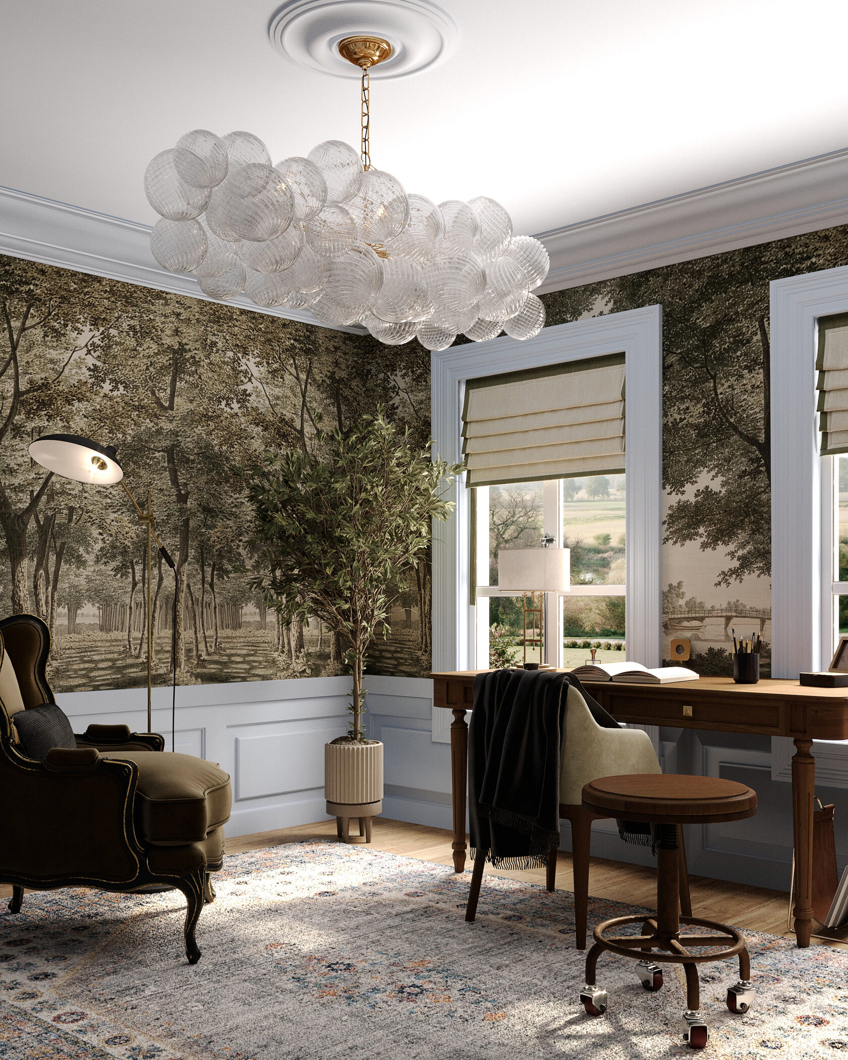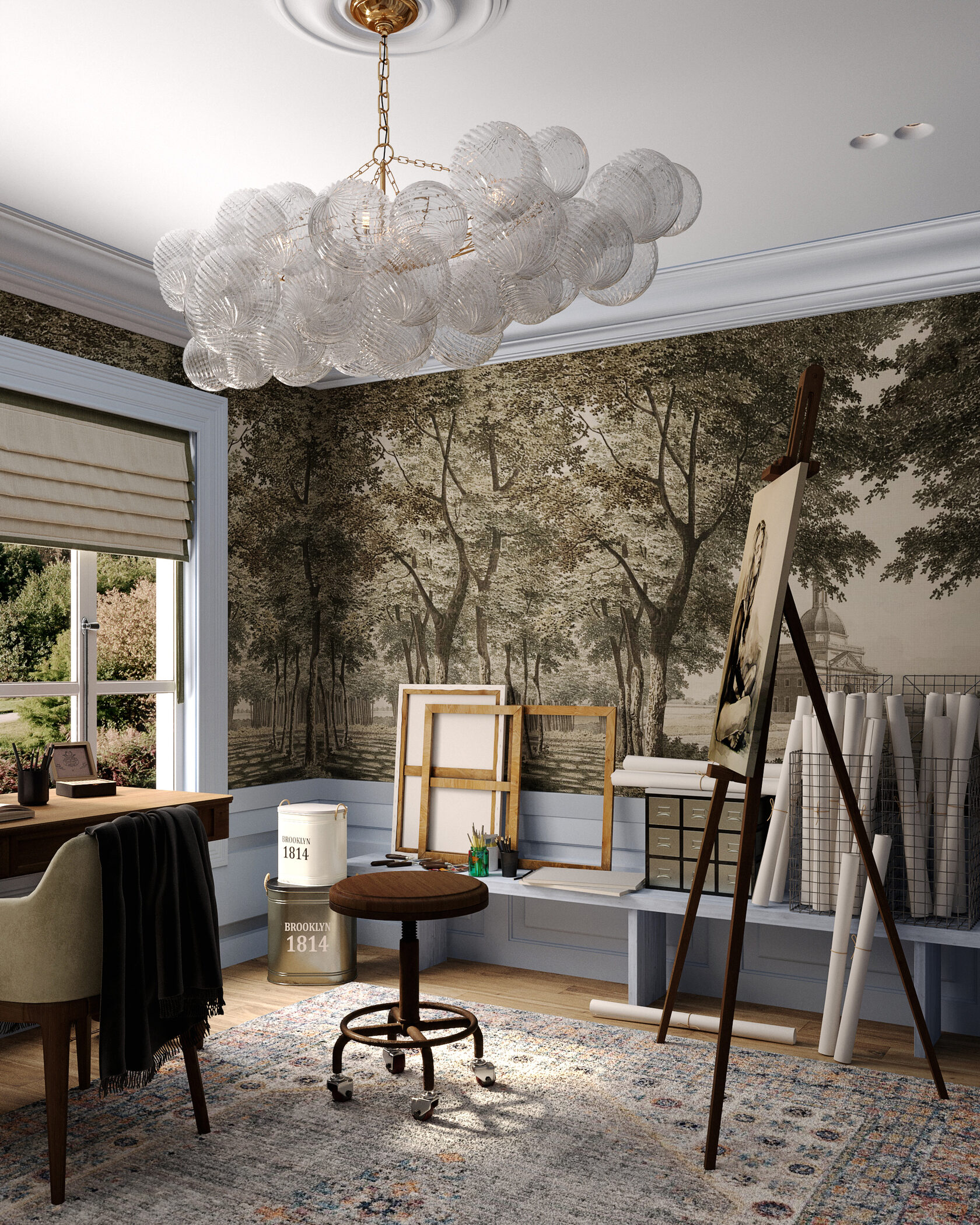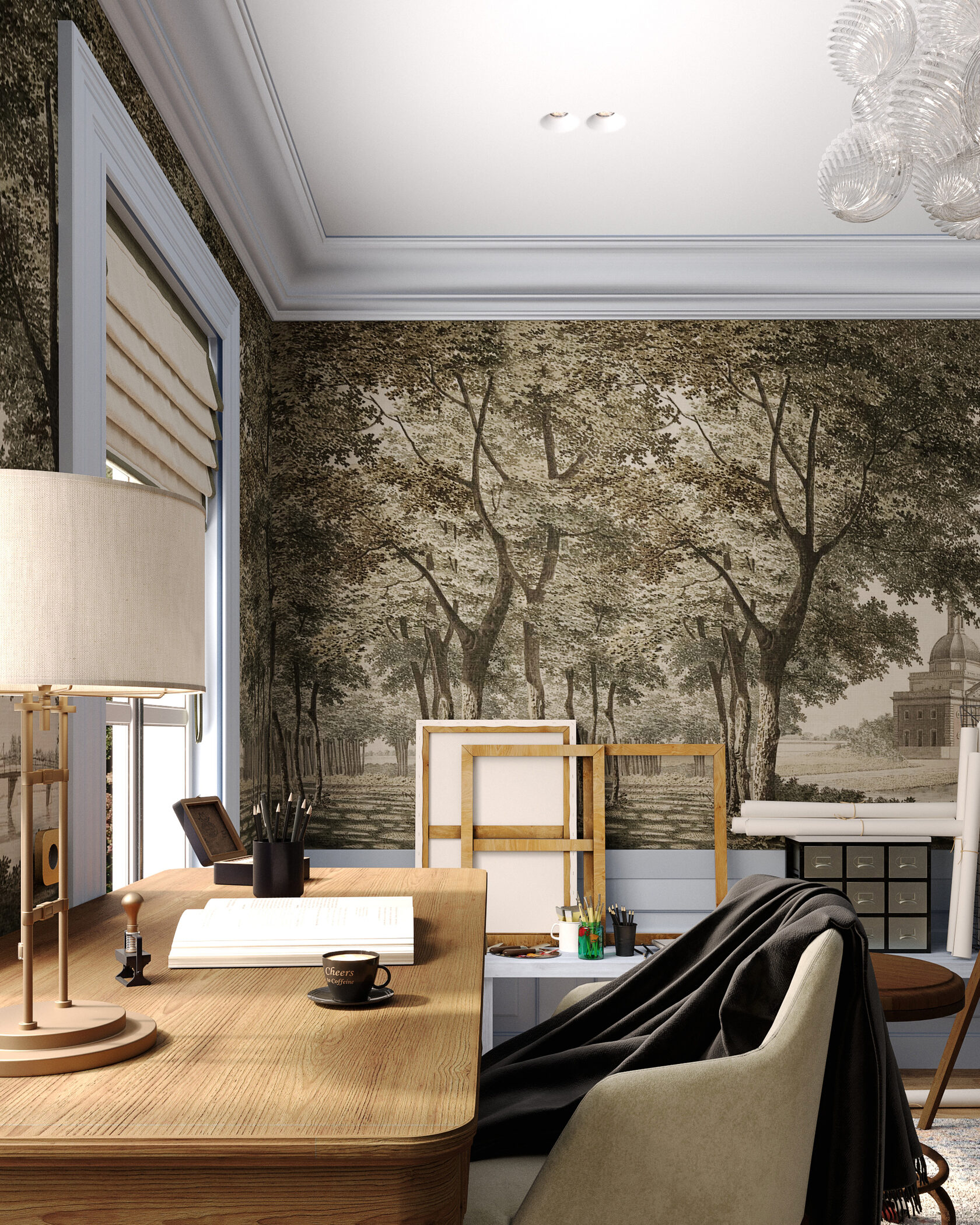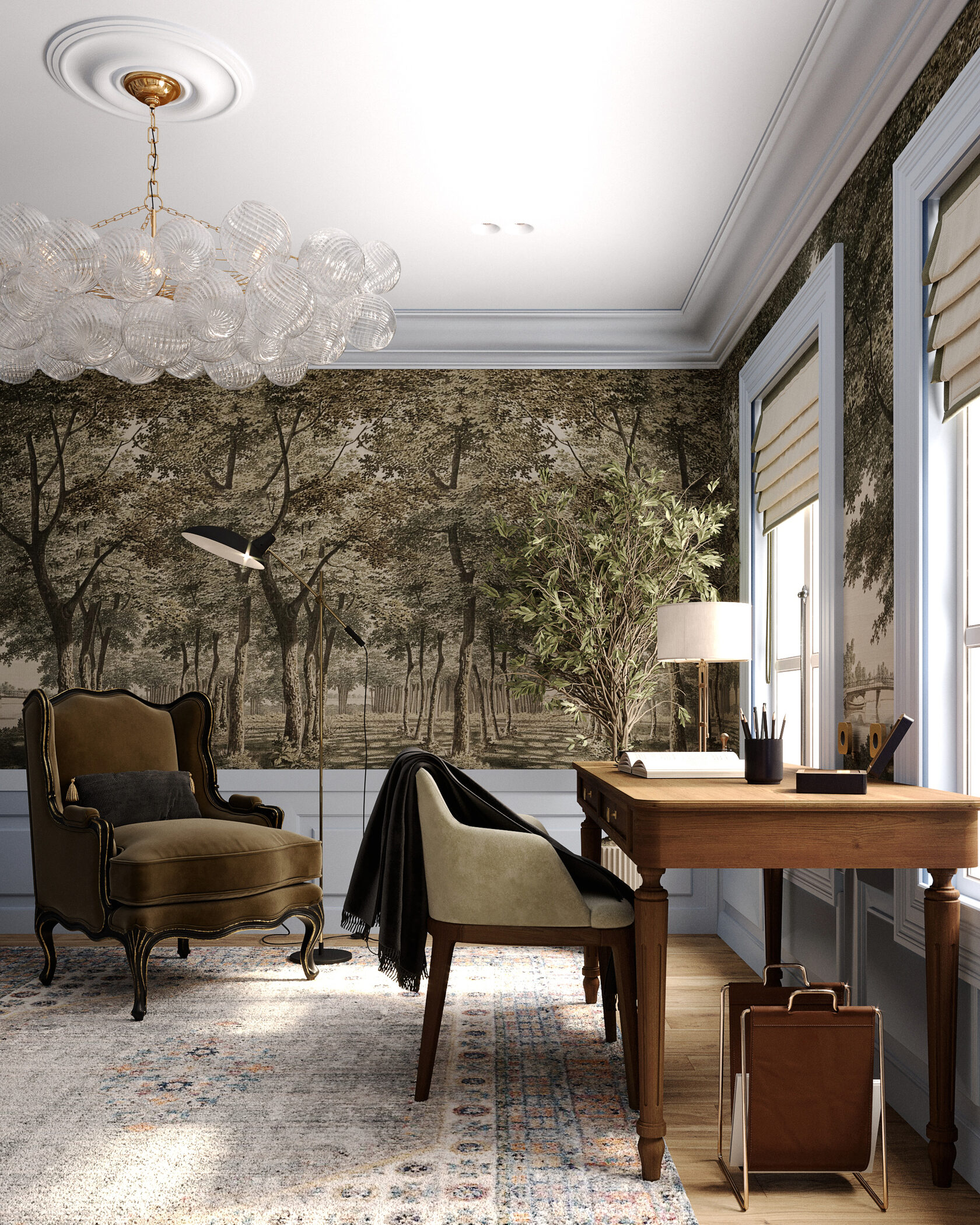 Здесь мотивы прошлого соседствуют с современно легкостью. Оформление стен, имитирующее старинный парк, состаренная мебель, деревянный пол, основательный стол, объемное мягкое кресло создают роскошную взрослую атмосферу. А зеркальные двери, обилие белого цвета и потолочный светильник с прозрачными плафонами, похожий на огромное облако, словно напоминают, что не стоит все воспринимать слишком серьезно и добавляют пространству легкости и воздуха. Этот интерьер дополняет свою хозяйку и помогает творить смело, ярко, уверенно.