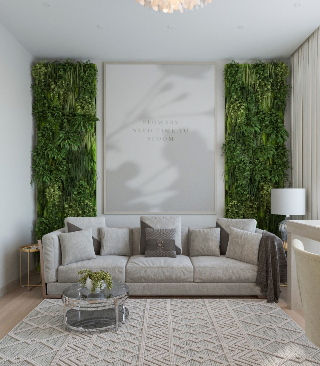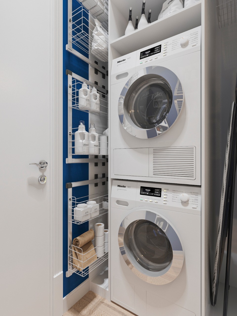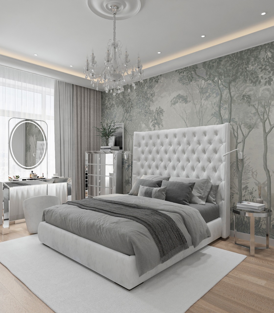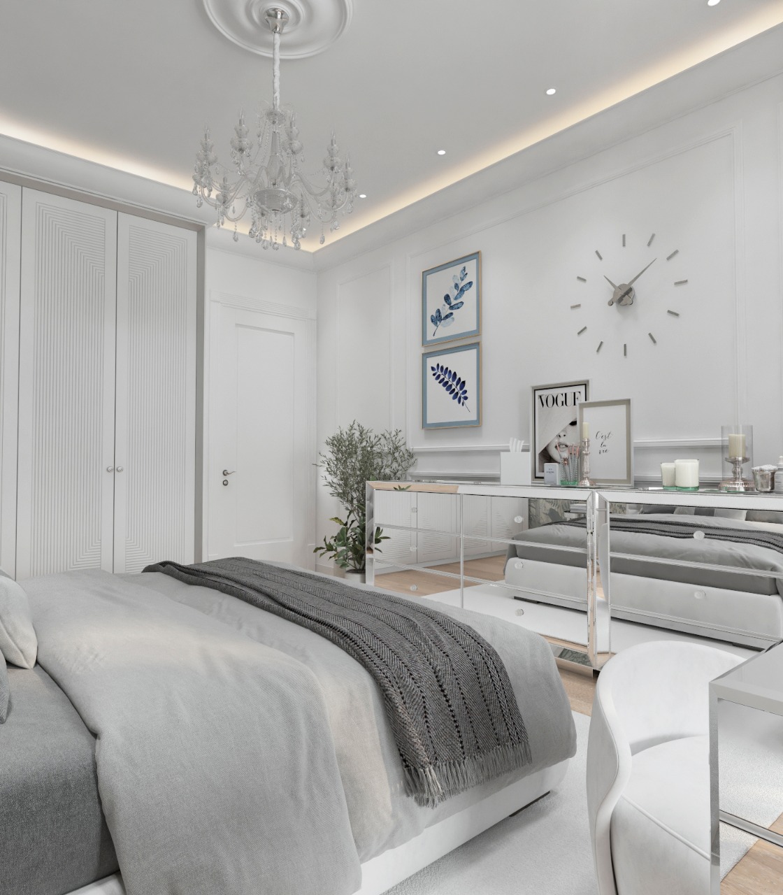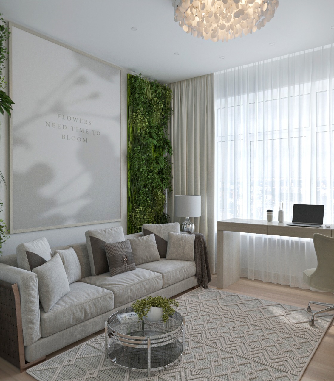 Максимальный состав помещений, комфортных для жизни молодой пары и возможностью принимать гостей (чаще всего родителей, что прилетают погостить из другого города): главная спальня, гостевая, основная ванная комната, гостевой су, раздельные гостиная и кухня, рабочий кабинет и кладовая с гардеробной. Интерьер очень лаконичный и "чистый", светлый и легкий.
