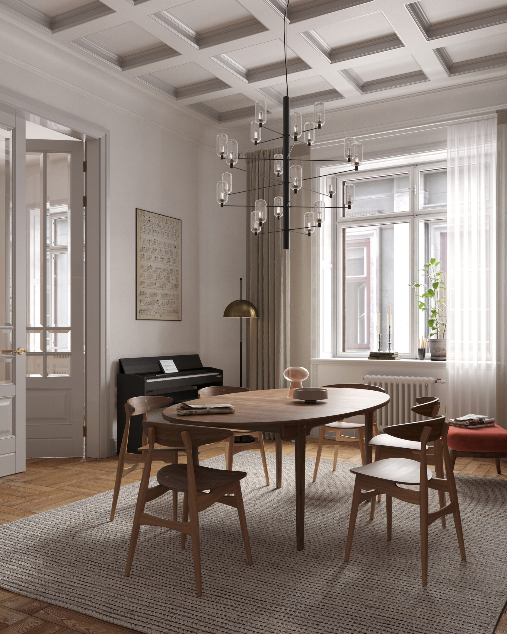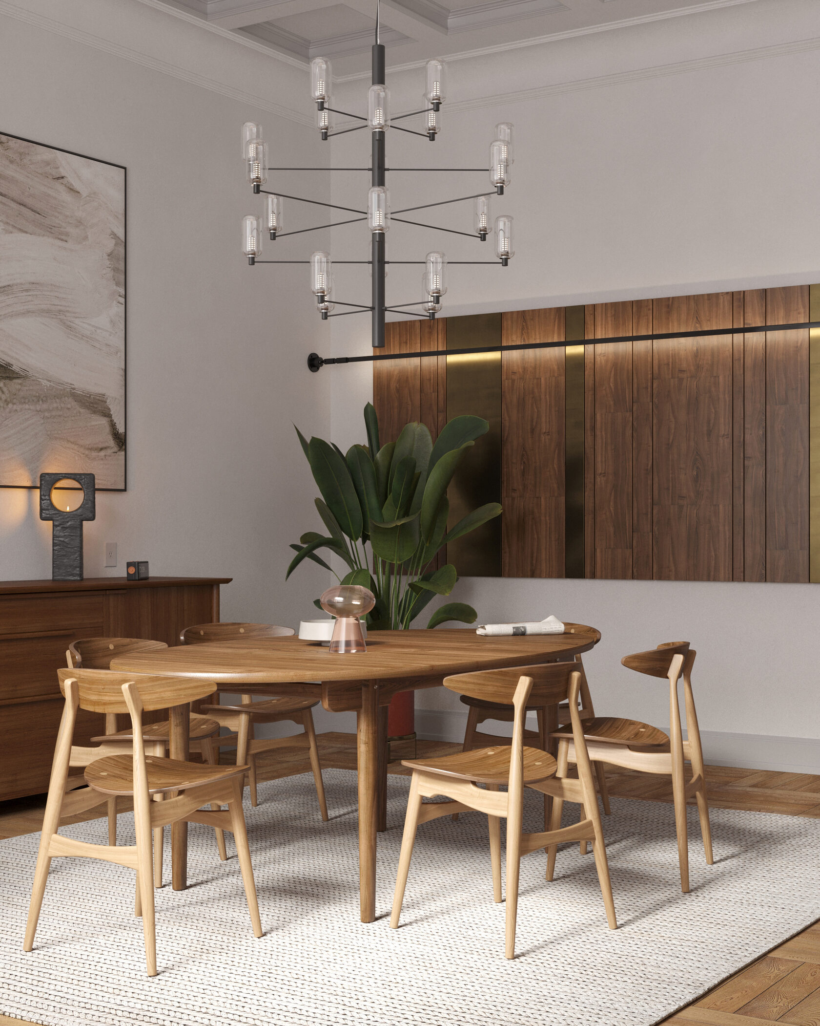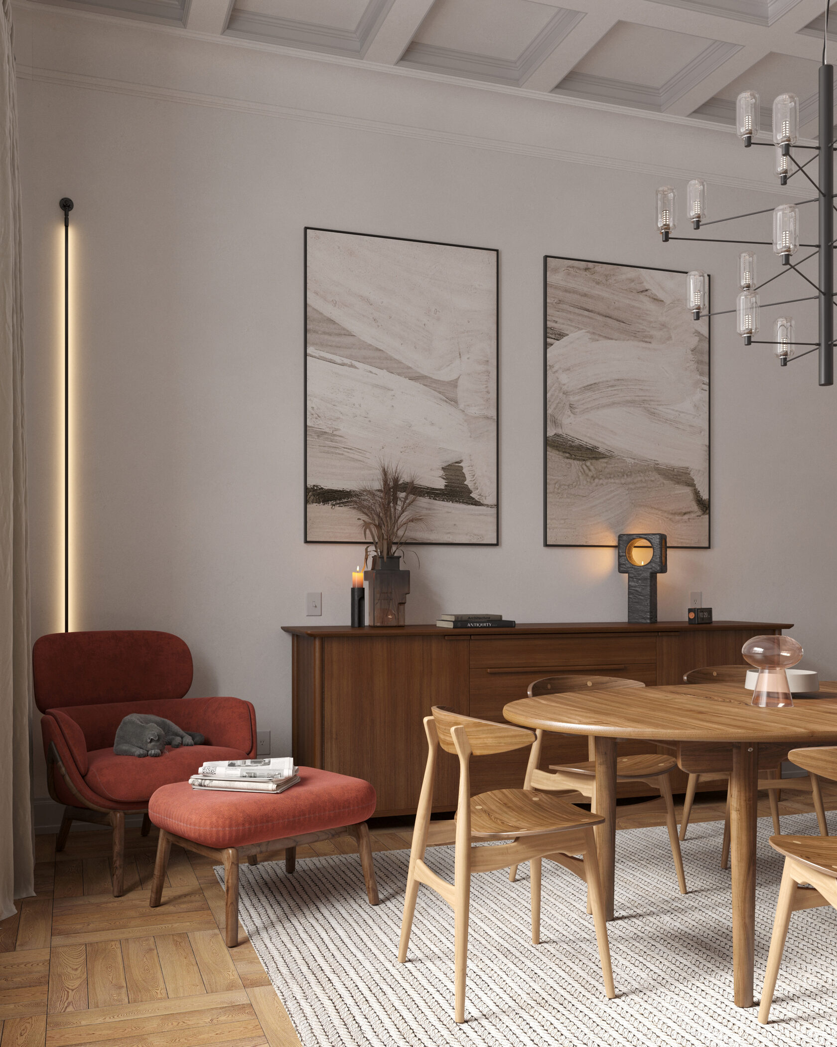 В центре композиции расположен обеденный стол на 6 человек с подвесным акцентным светильником, на который мы обращаем внимание при входе в комнату. Фоном для этой мебельной группы служит комод и два холста, расположенных симметрично на стене. Музыкальный инструмент, комод, мягкое кресло и стеллаж функционально дополняют пространство.