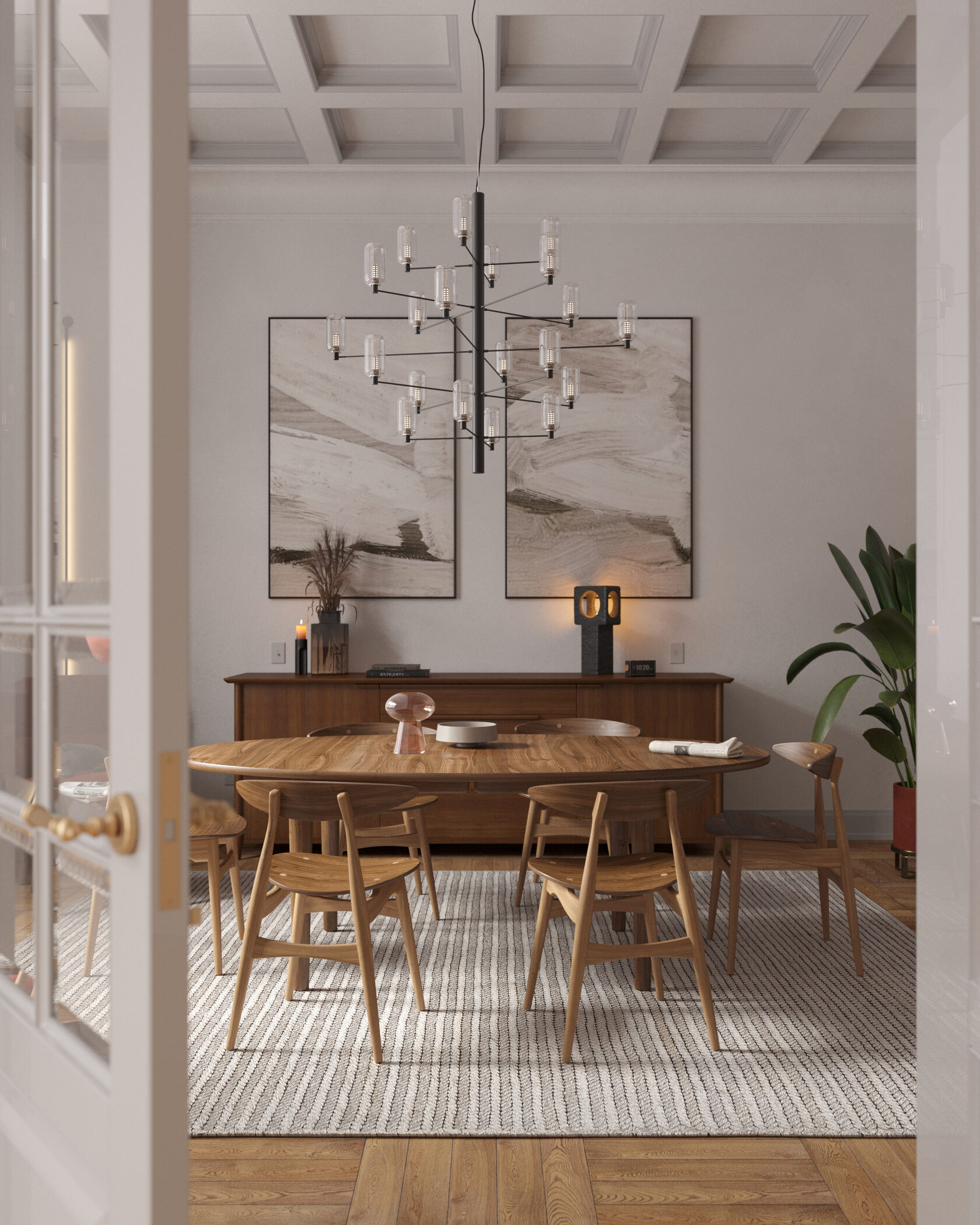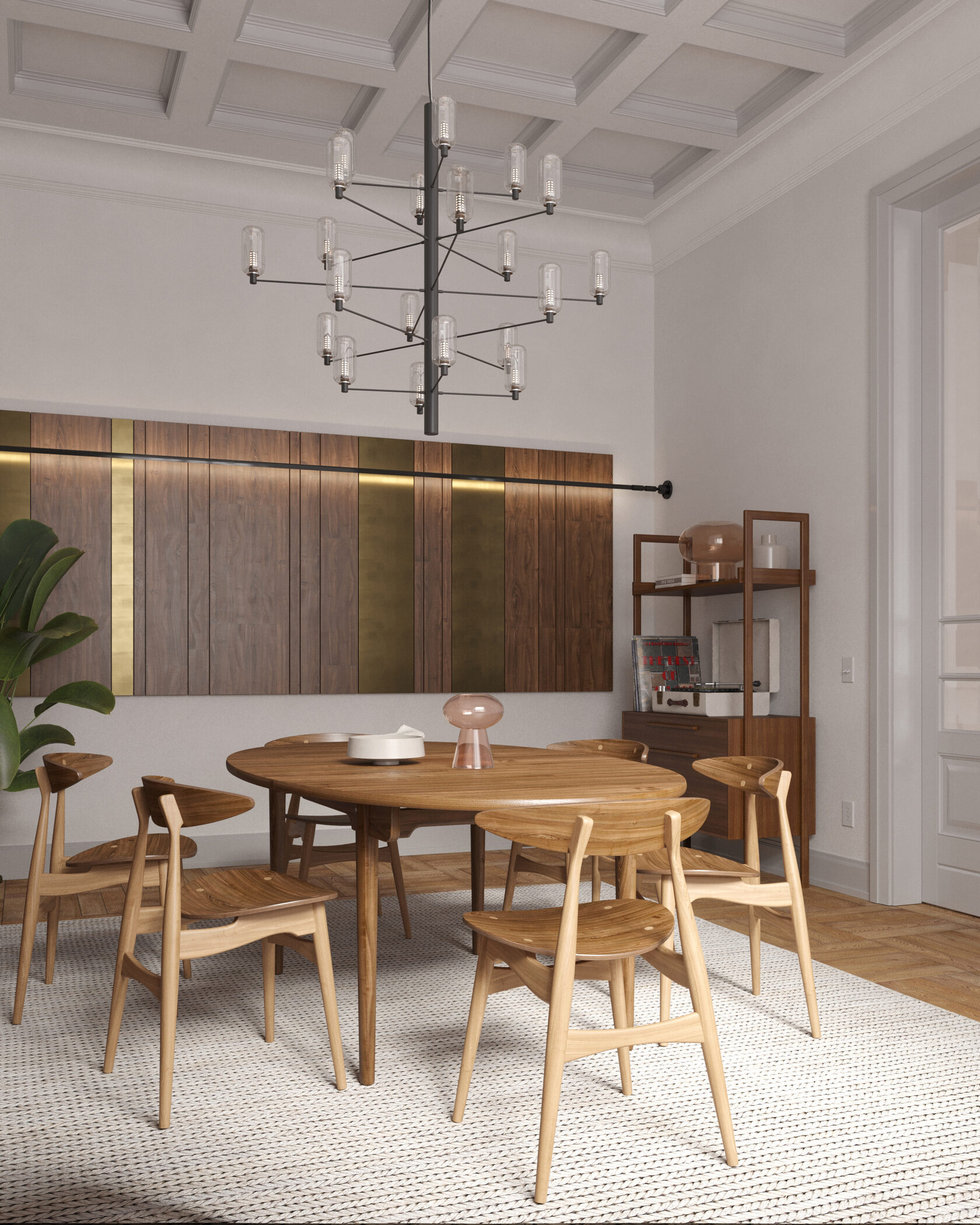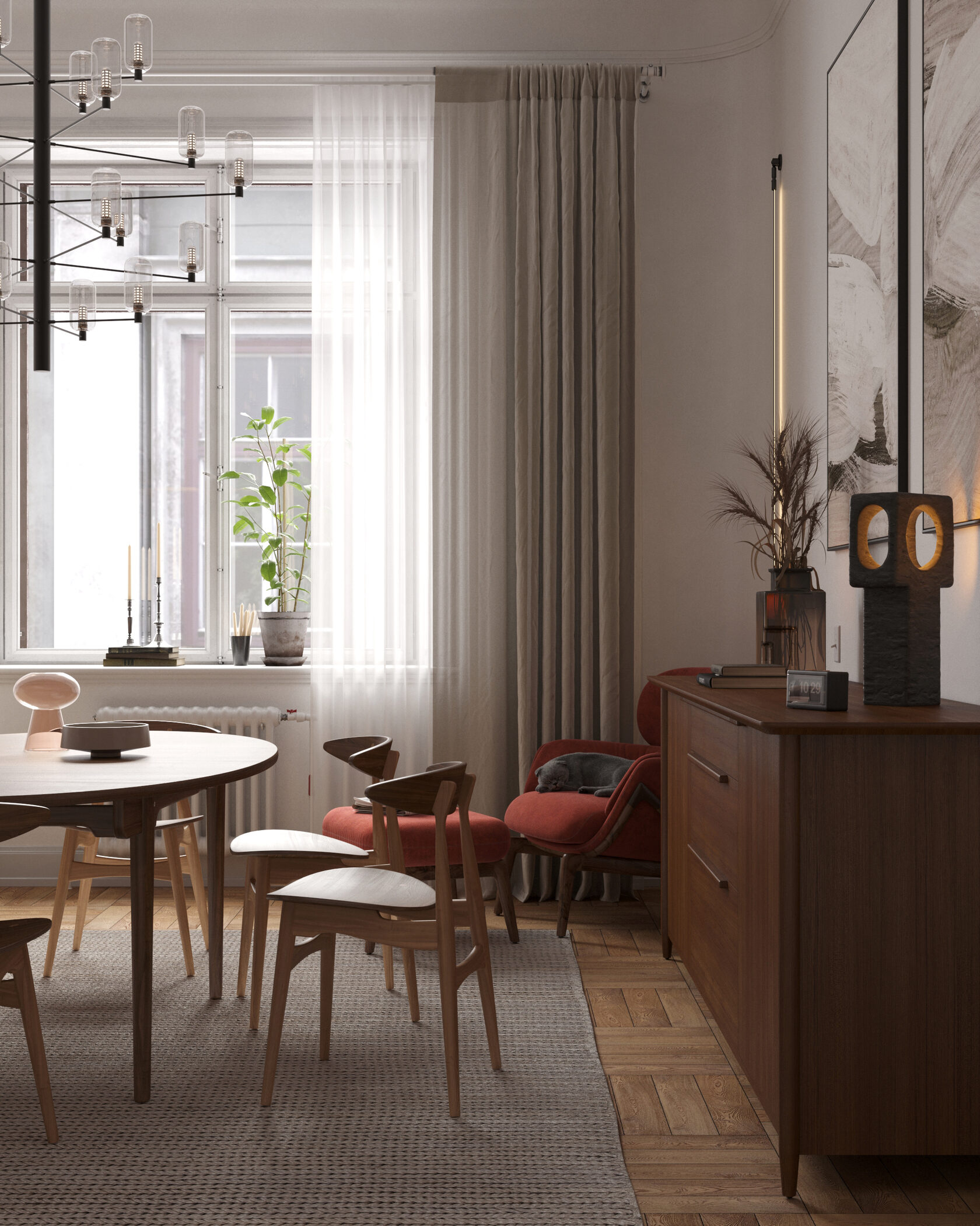 В центре композиции расположен обеденный стол на 6 человек с подвесным акцентным светильником, на который мы обращаем внимание при входе в комнату. Фоном для этой мебельной группы служит комод и два холста, расположенных симметрично на стене. Музыкальный инструмент, комод, мягкое кресло и стеллаж функционально дополняют пространство.