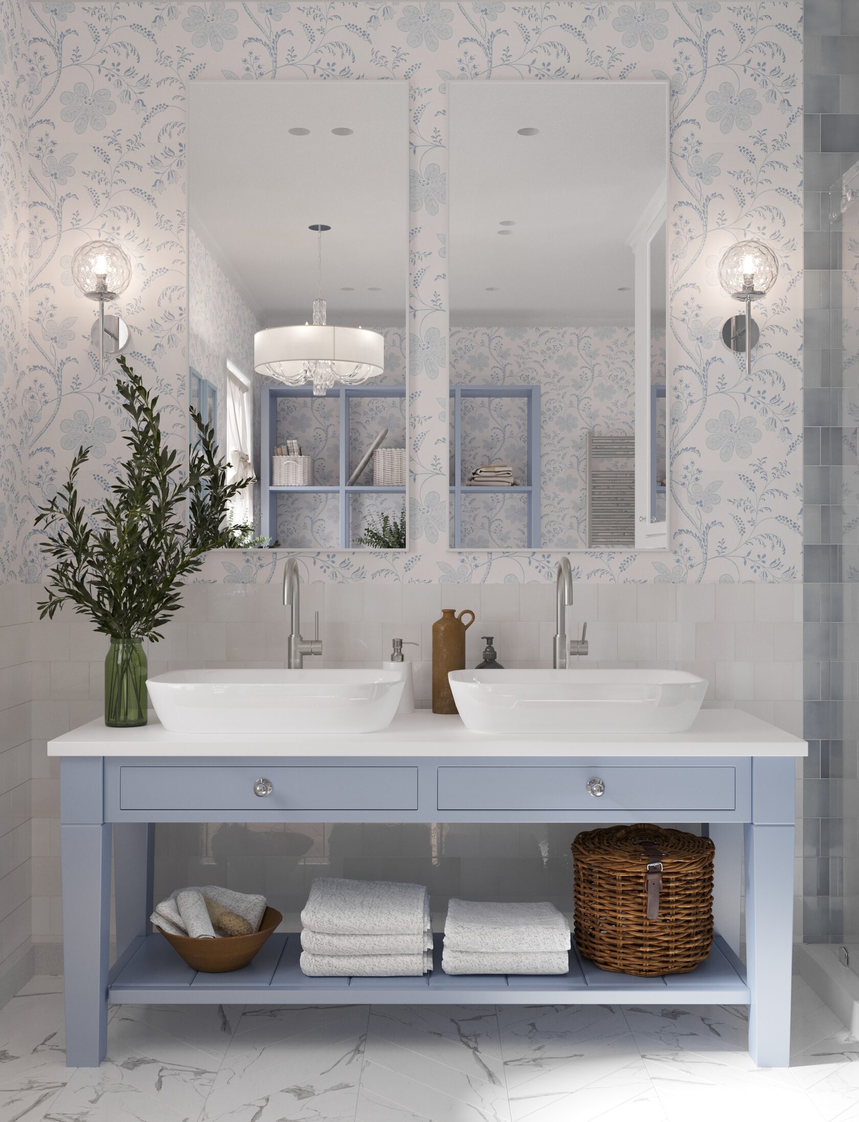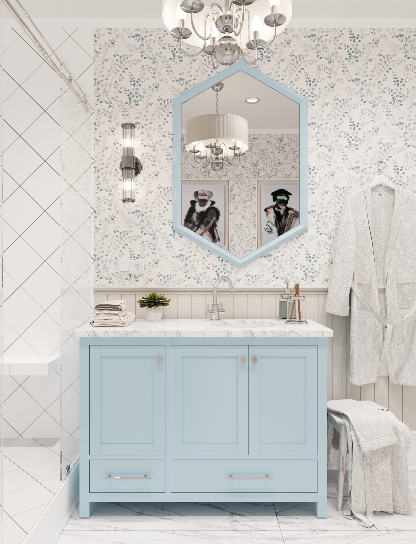 На втором этаже – приватная зона для хозяйки дома и ее дочерей. Здесь большая раковина и много мест хранения, чтобы разместить различные баночки и девичьи мелочи.