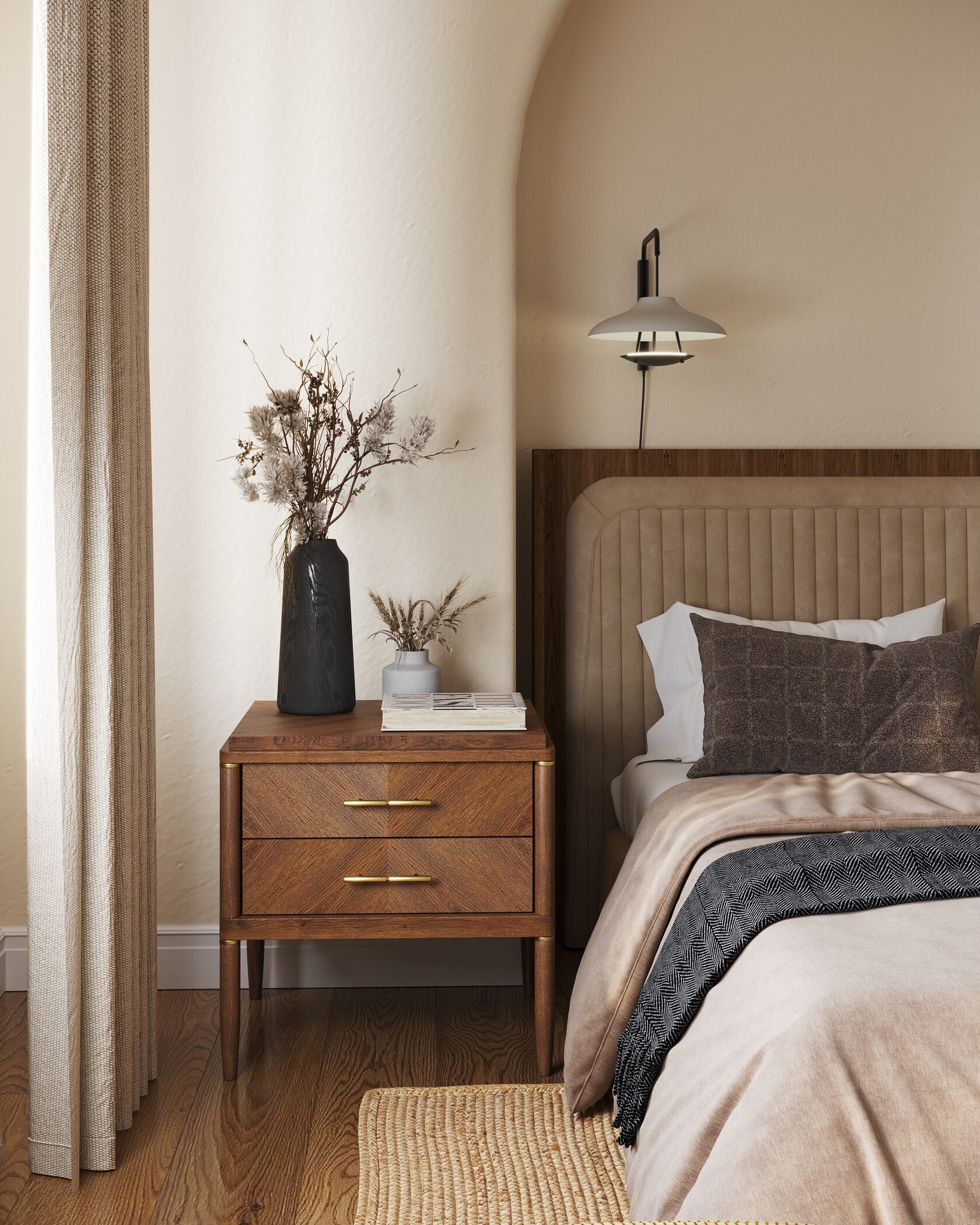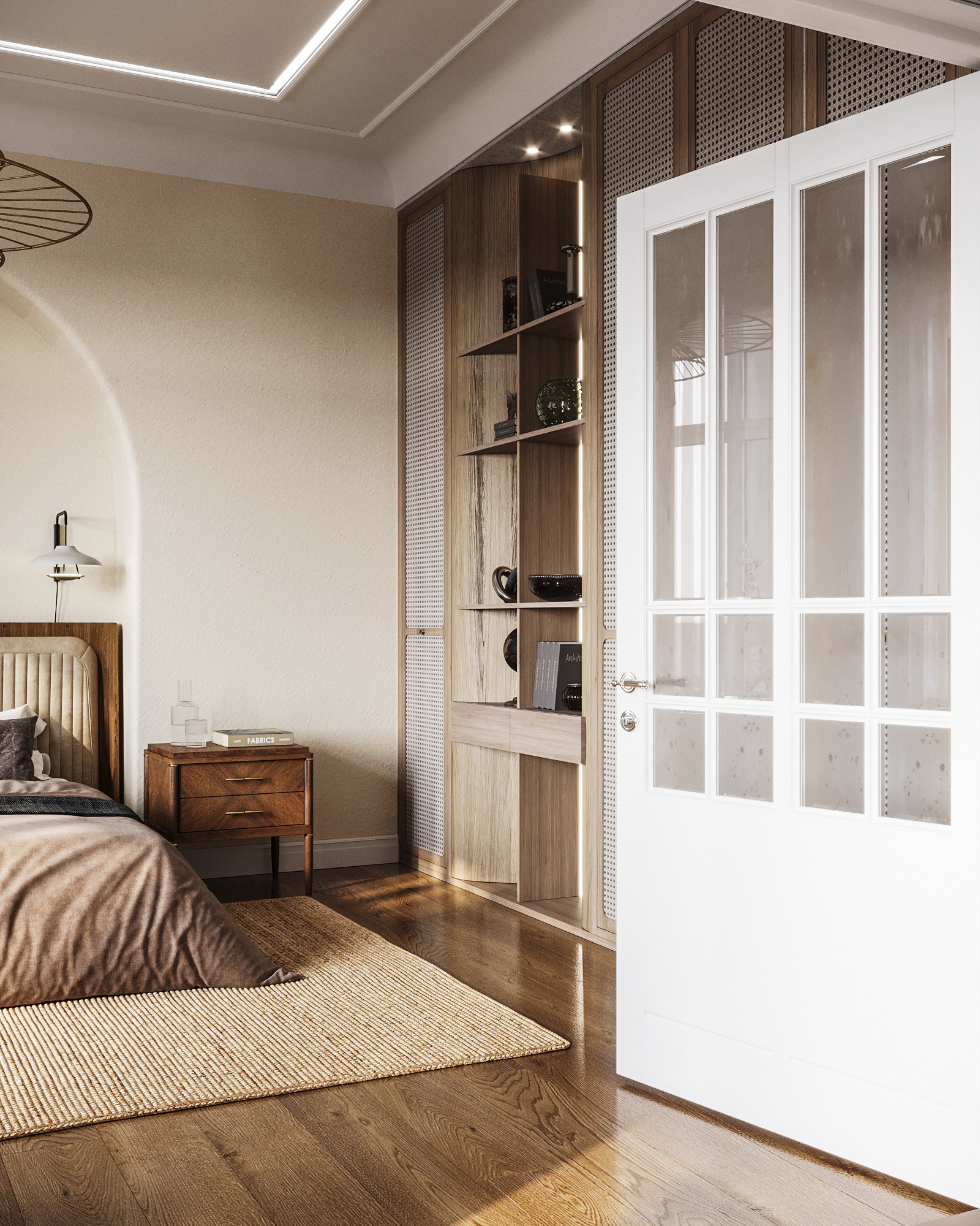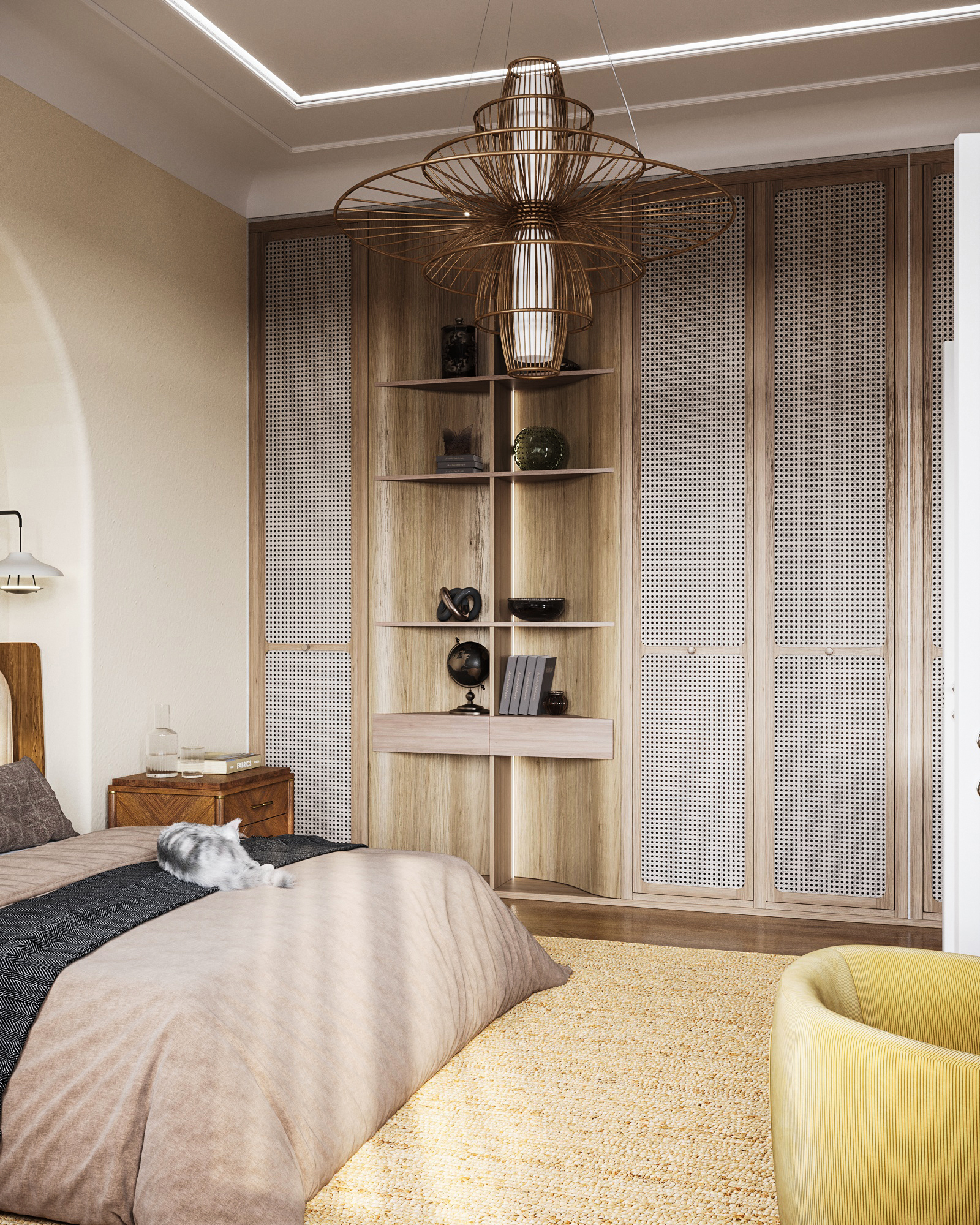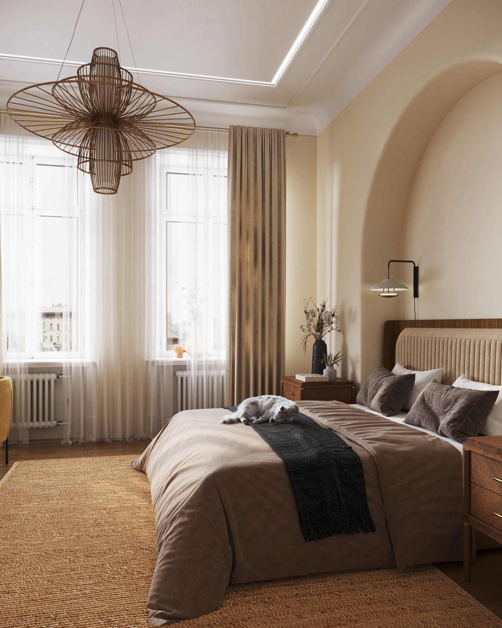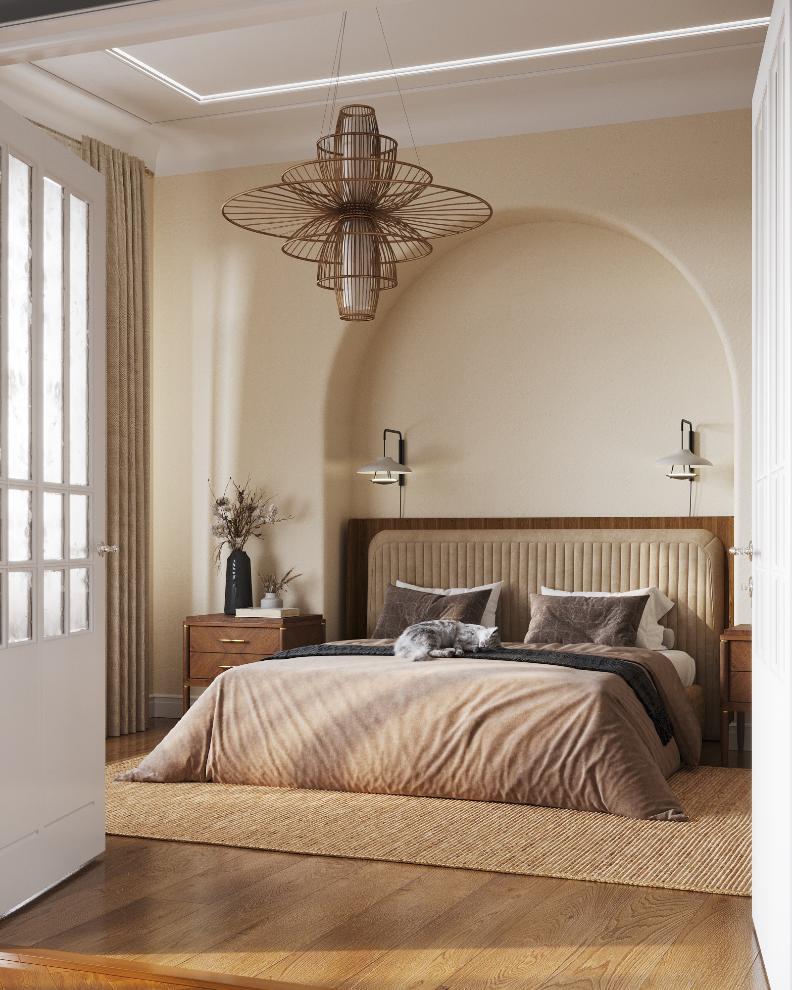 Спальня в теплых оттенках, согревающая и обволакивающая уютом как закатное солнце в южной стране.