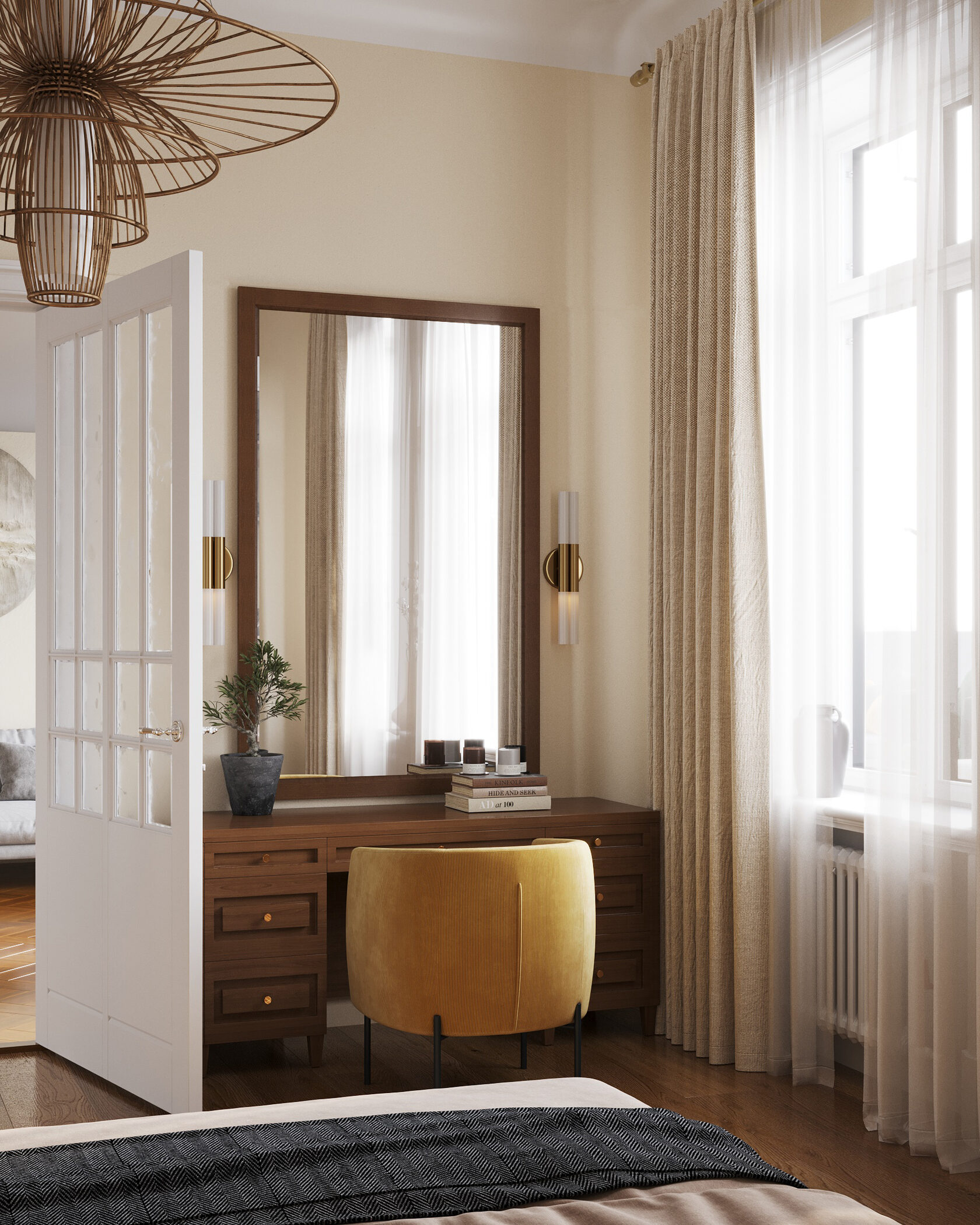 Массивный туалетный столик с большим количеством мест хранения, зеркалом и подсветкой занимают уединенное место в углу комнаты.